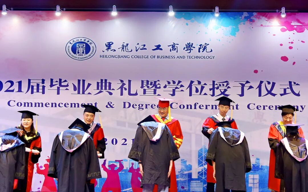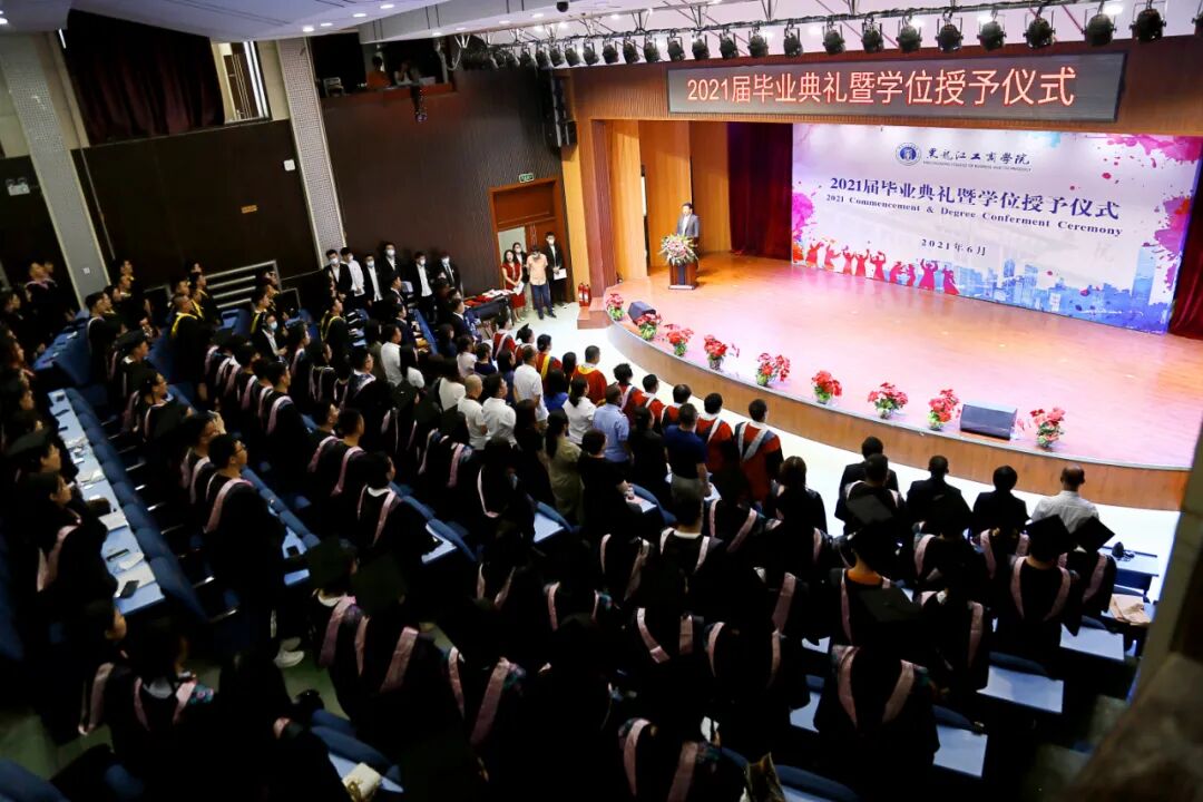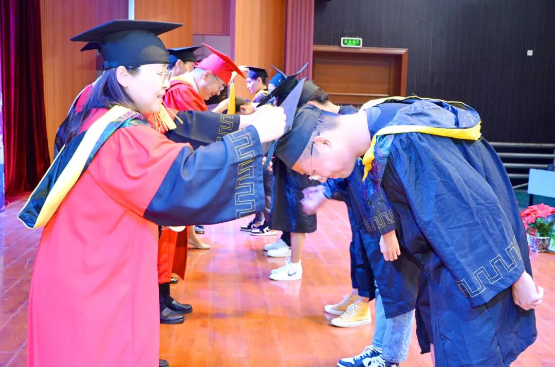 图说:6月28日,爱游戏(中国)2021届学生毕业典礼暨学位授予仪式在报告厅隆重举行。意气风发的毕业生依次走上主席台,从学校学位评定委员会各位委员手中庄严接过学位证书,接受拨穗,授予学位并合影留念。