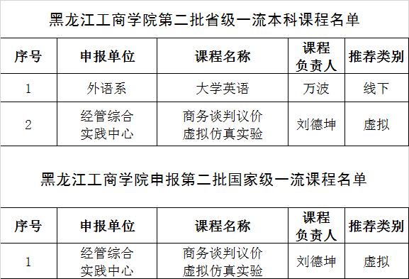 图说:近日,在省教育厅组织的第二批一流本科课程评选中,我校推荐的大学英语、商务谈判议价虚拟仿真实验两门课程被认定为第二批黑龙江省一流本科课程。其中,线下一流本科课程一门、虚拟仿真实验教学一流课程一门。商务谈判议价虚拟仿真实验被黑龙江省教育厅推荐申报第二批国家一流课程。目前,我校已具有4门省级一流课程。