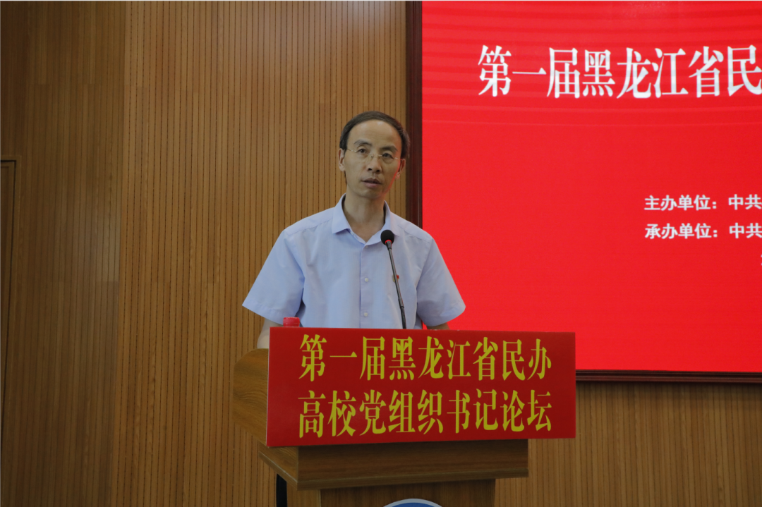 图说:为深化党建“示范创建”,推动民办高校党建提质增效,6月23日,省委教育工委举办第一届黑龙江省民办高校党组织书记论坛。我校党委书记徐德荣在会上作题为《以“14445”模式为载体 推进党建“示范创建”》的交流发言。