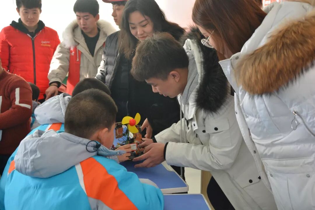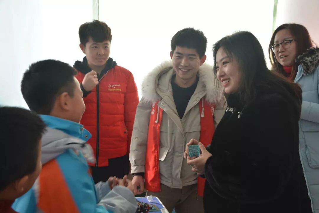 大学生志愿者和四明小学的儿童们来到了一楼教室。在那里,大学生志愿者们根据自己的专业特色和儿童的兴趣爱好展开了专业有趣的口才培训、互动活泼的英文学习、科技创新的电子机器人展示等7种特色课程。