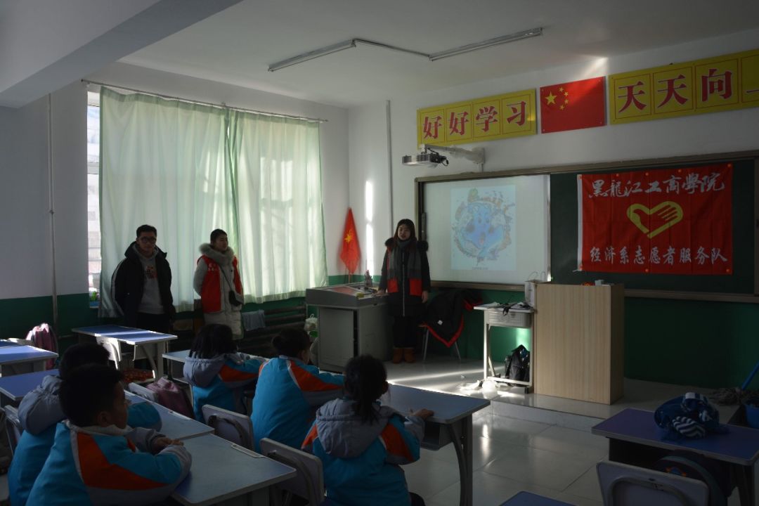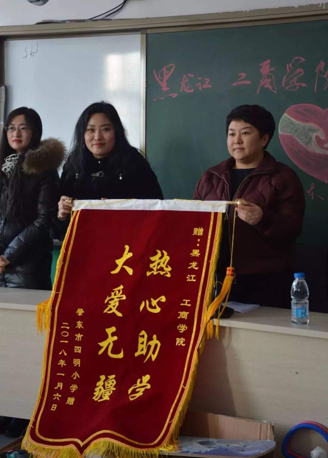 夕阳悄悄地变成了月亮,每一个早晨太阳慢慢升起。当大家在家中享受着寒假生活时,1月6日,校团委书记张玉娜、心理健康教育中心吕文婷、团委干事王佳就近召唤回各系青年志愿者35人。他们共赴肇东市四明小学开展“大手拉小手”关爱行动。肇东市四明小学党委书记、校长刘雪杰代表肇东市四明小学向我院赠送了锦旗。